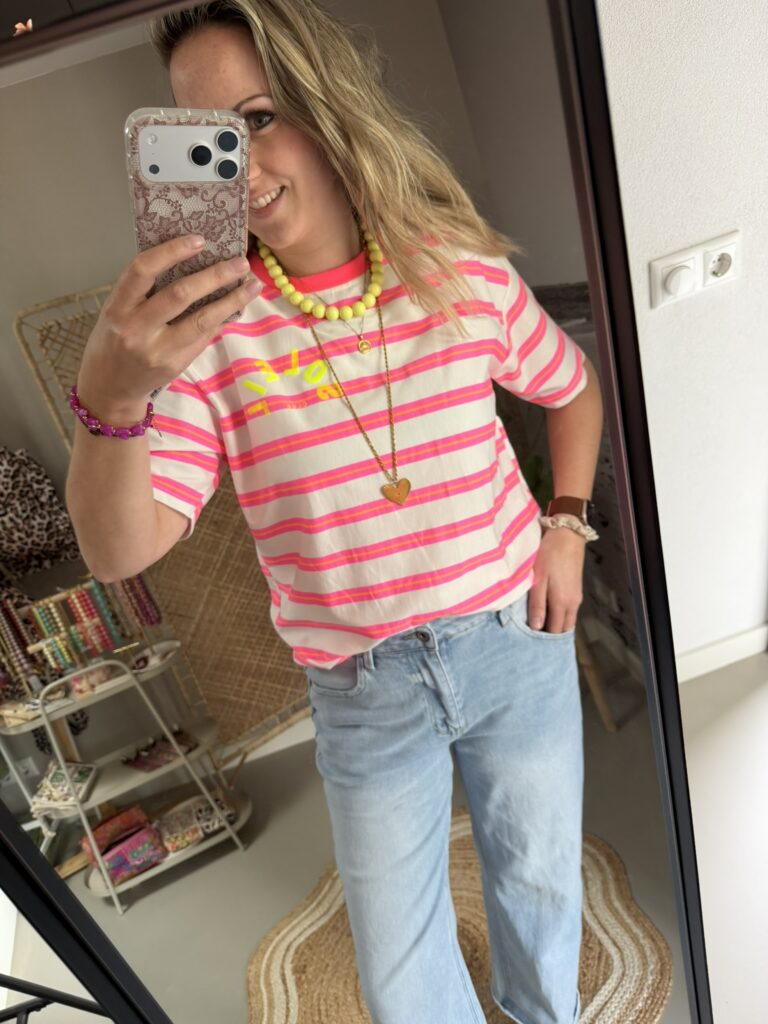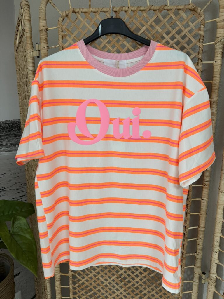 T-shirt streep ‘Qui.’ – Wit/Oranje/Roze
