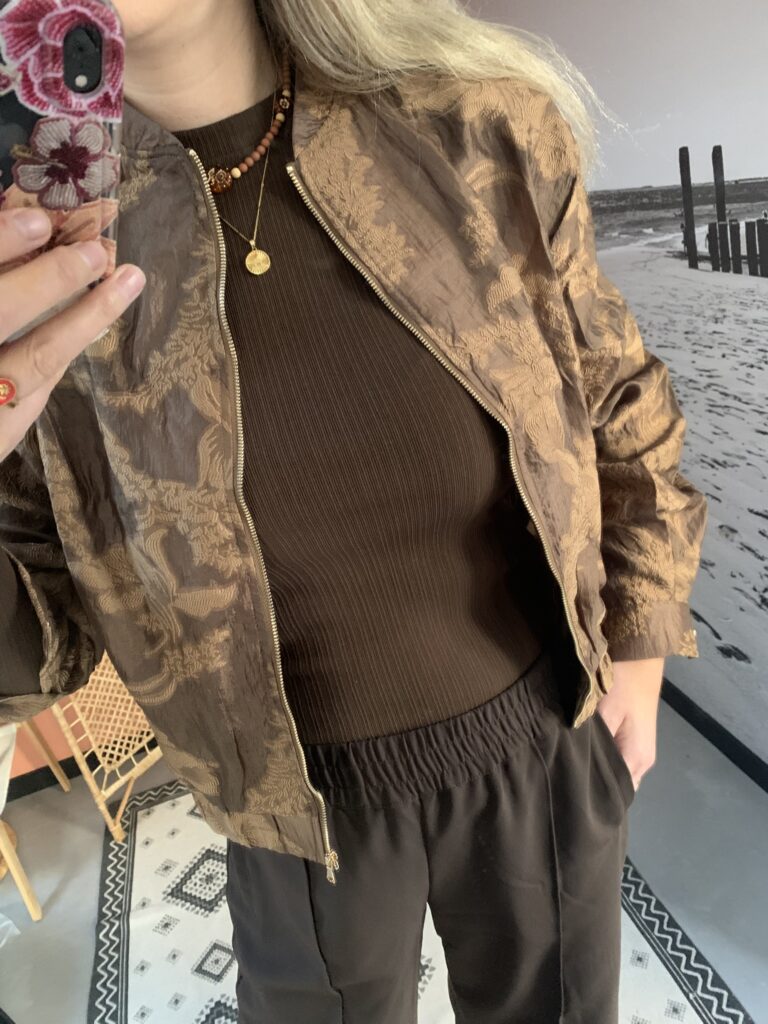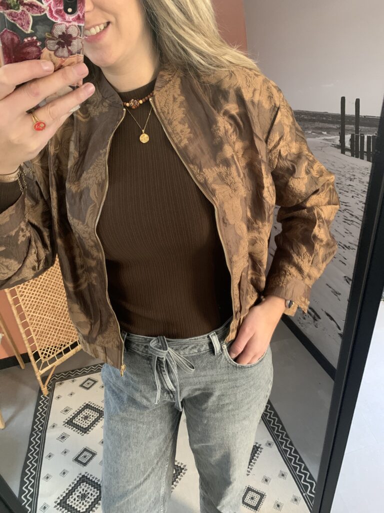 Dan is deze bomber in de warm brons-bruine tint met een subtiele jacquard glans echt iets voor jou!