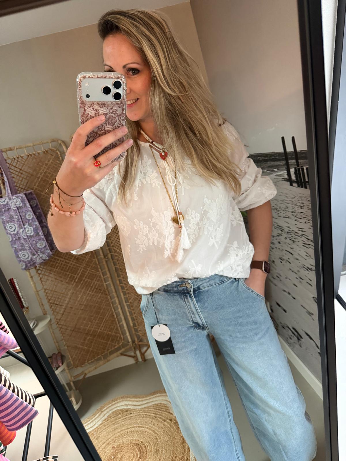 Draag de blouse bijvoorbeeld op een mooie lichte jeans of pantalon.