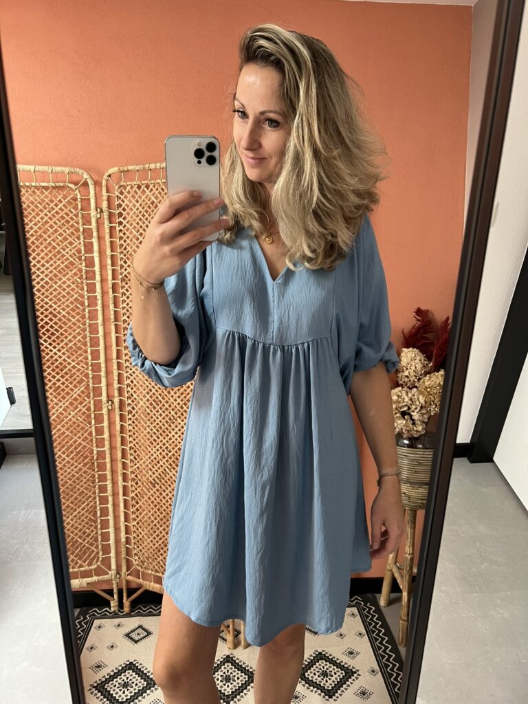 (Jeans)Blauw basic jurkje met ballon mouwtje.