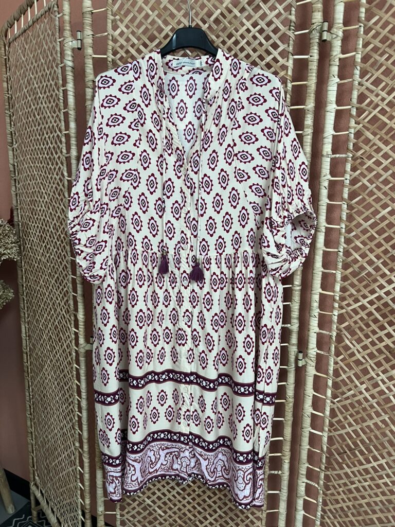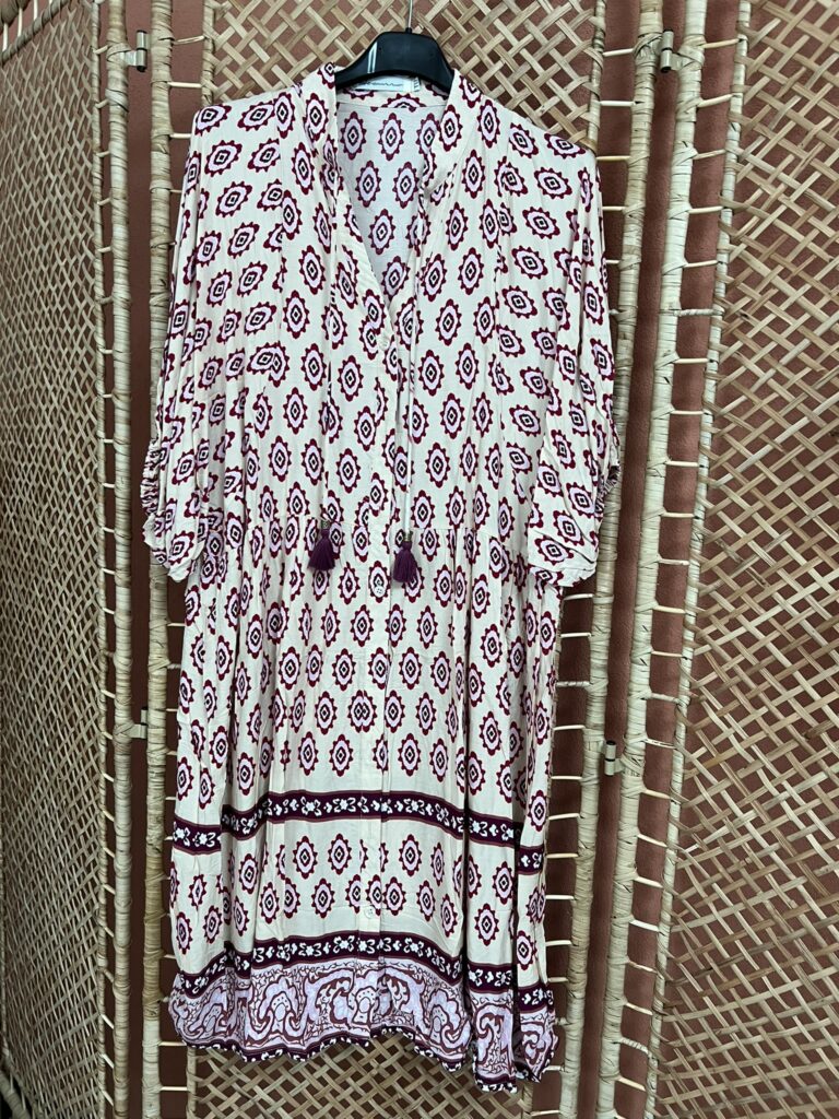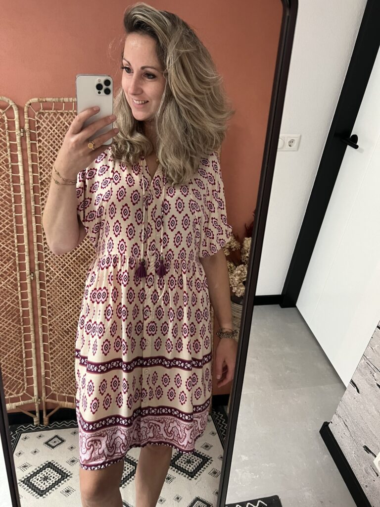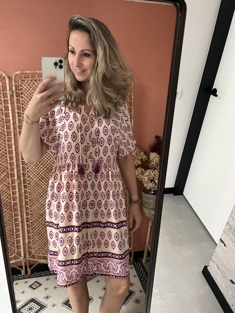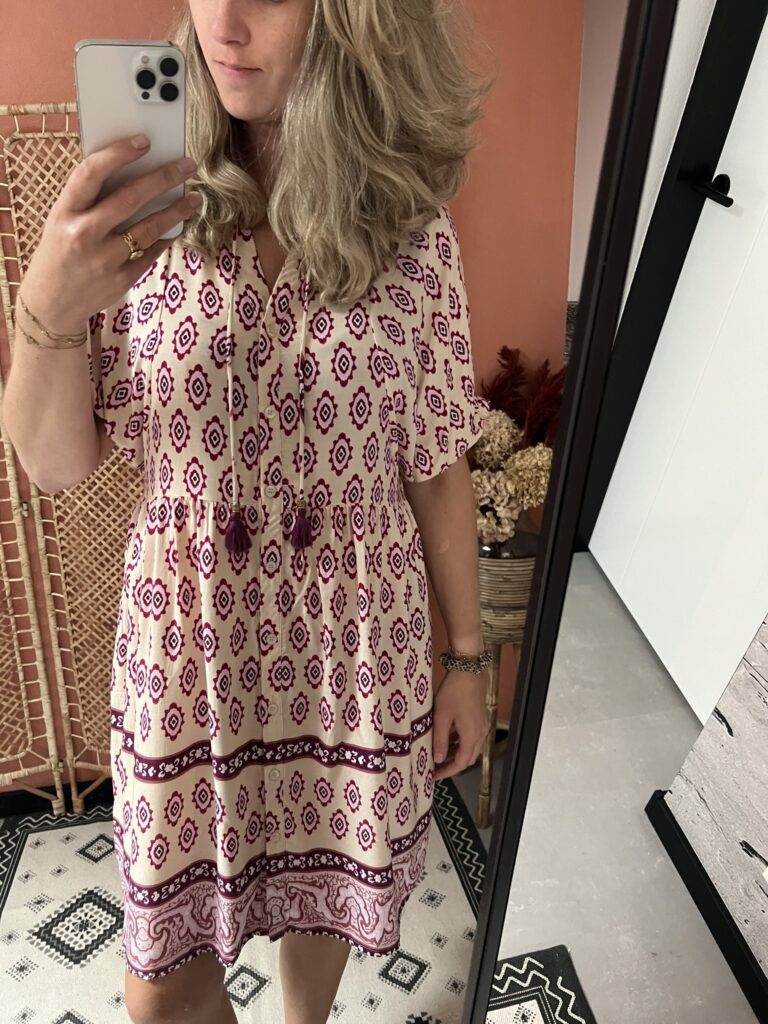 Deze blouse jurk is voorzien van knoopjes en heeft als leuk detail twee koortjes met een mooi kwastje eraan.