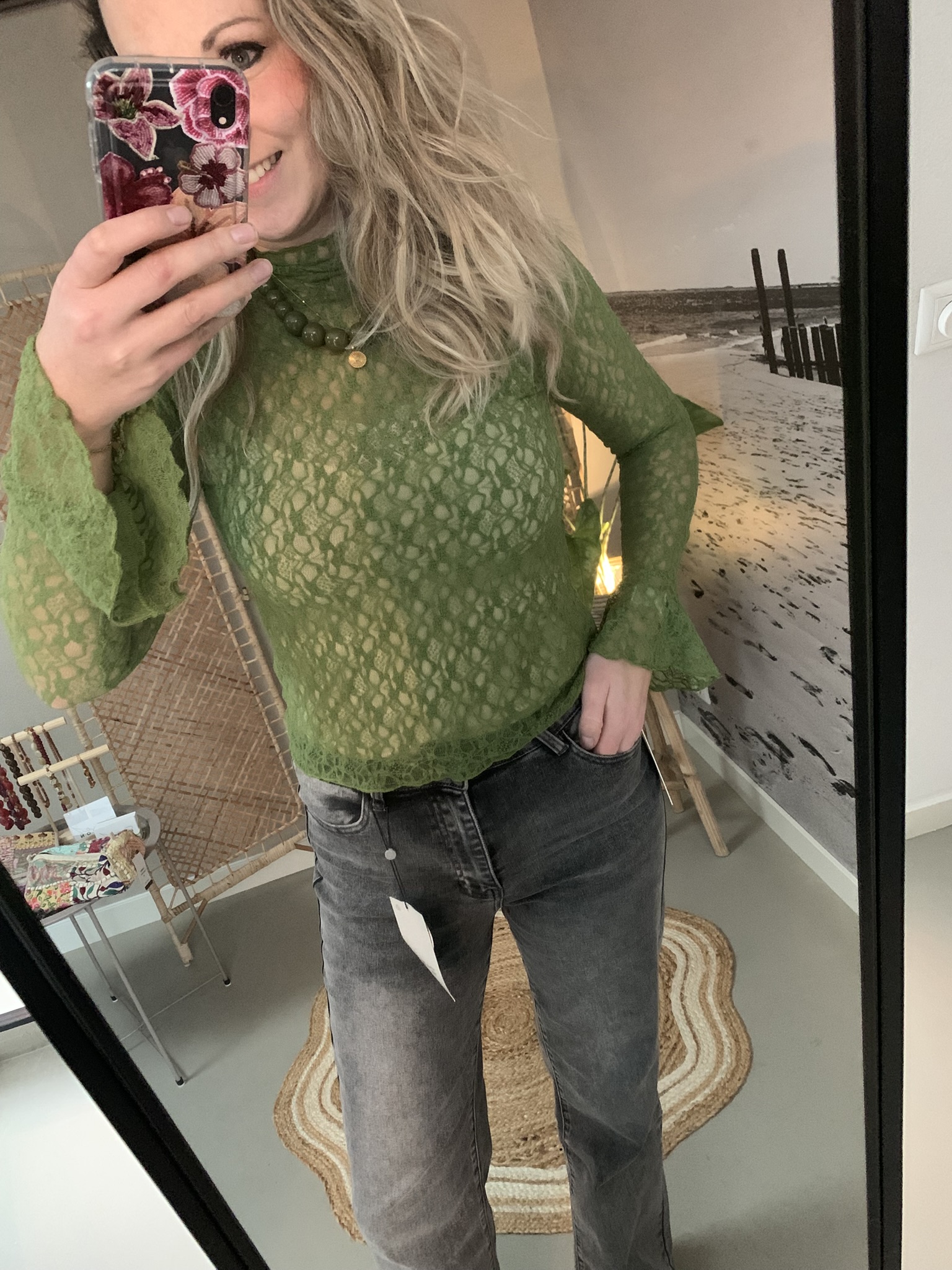 Kantentop met trompetmouwtje - Olijfgroen aantal
