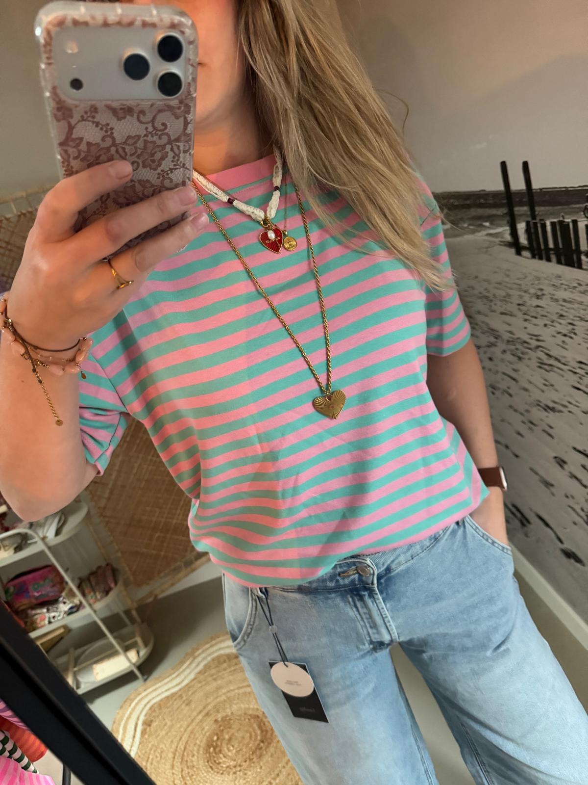 Streep t-shirt/shortsleeve – Mint/Roze