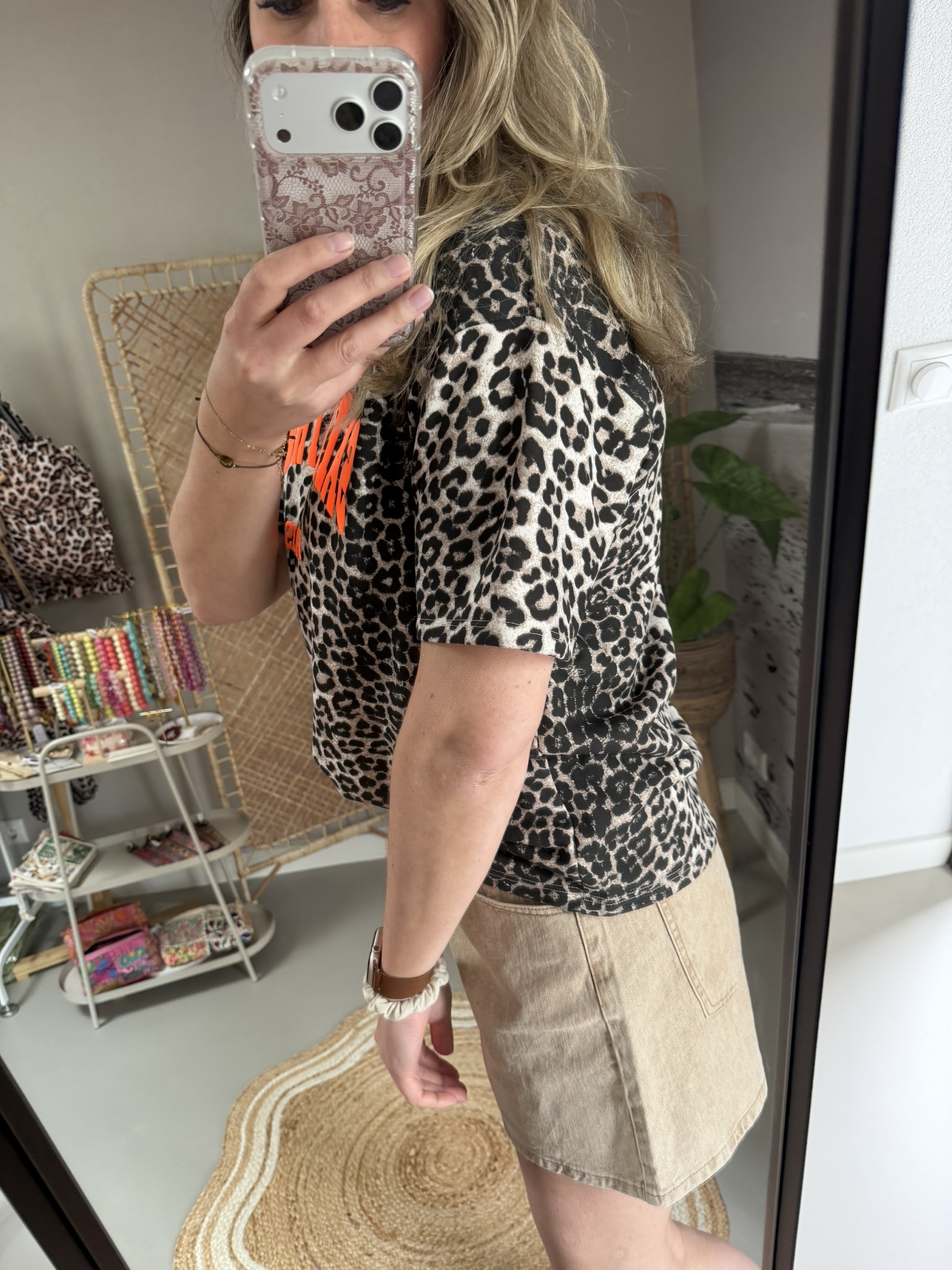T-shirt panter ‘Saint-Tropez Paris’ – Oranje/Bruin