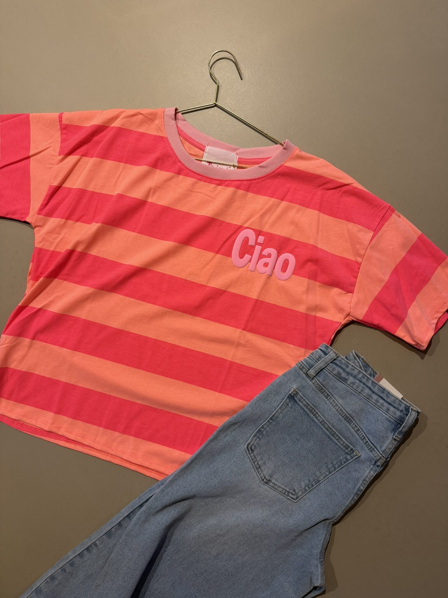 T-shirt streep ‘Ciao’ – Rood/Roze/Oranje