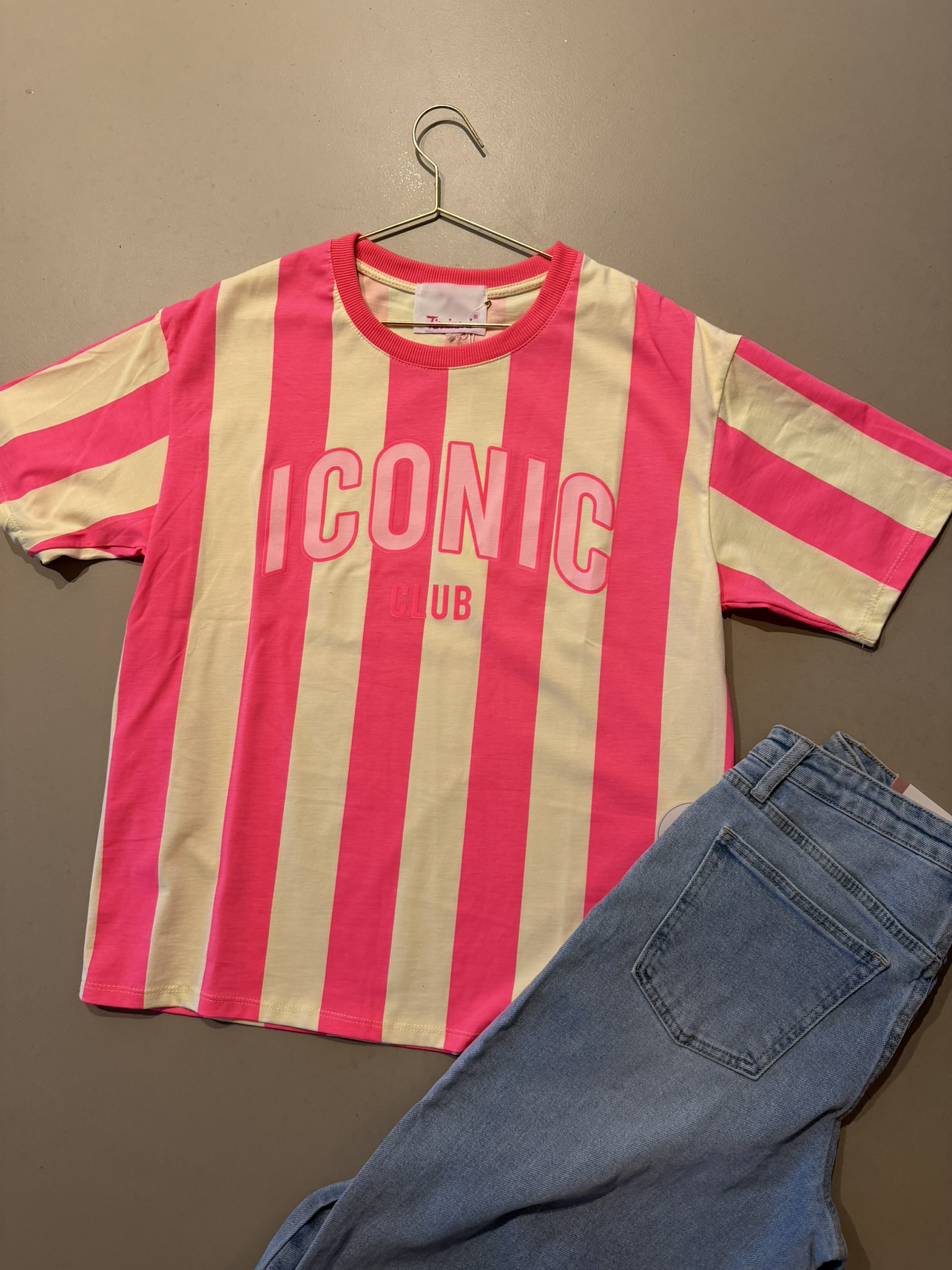 T-shirt streep ICONIC - Roze/Geel aantal