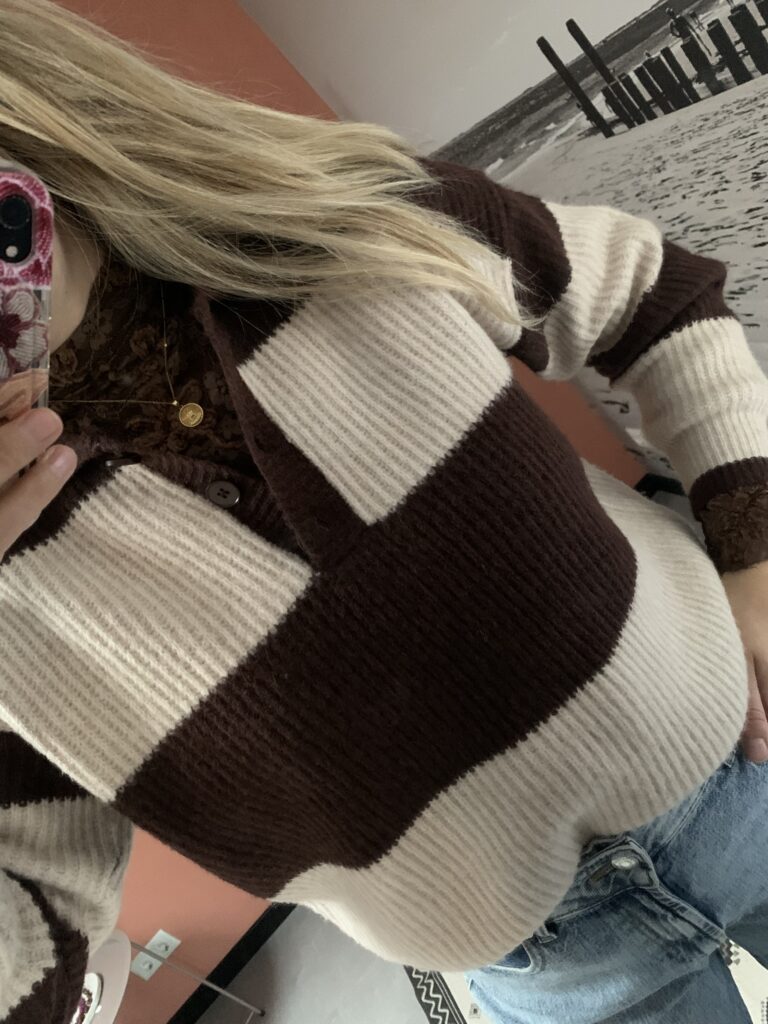Zacht gebreid truitje, voorzien van een kraagje, knopen en streep patroon.